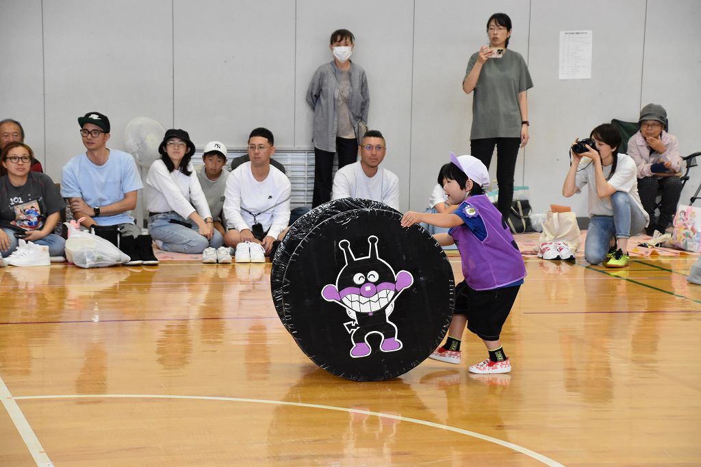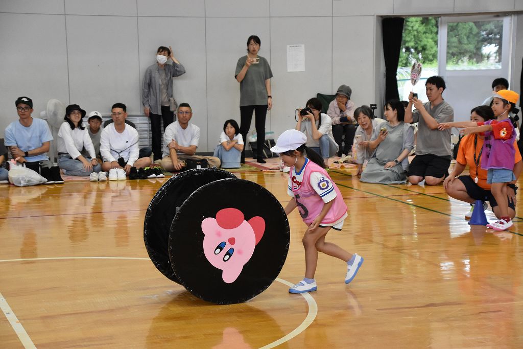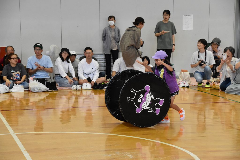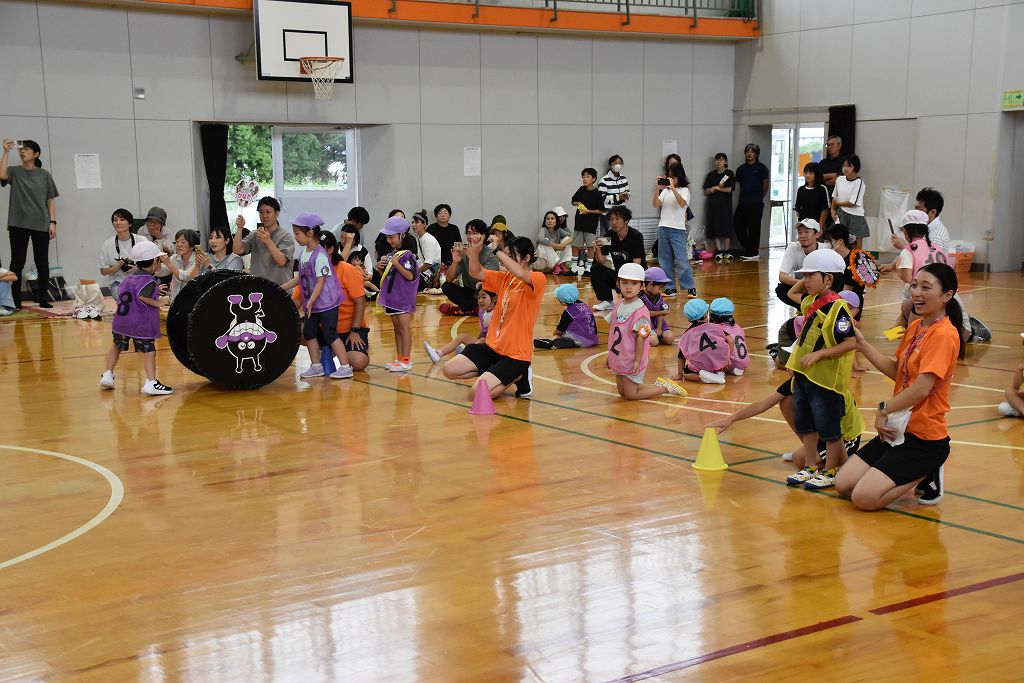 意外とコツが必要なんです、これ。そしてダンベルを次の子に渡したらすぐによけるっていうのと戻らないっていうルールを何回も確認して練習しました。