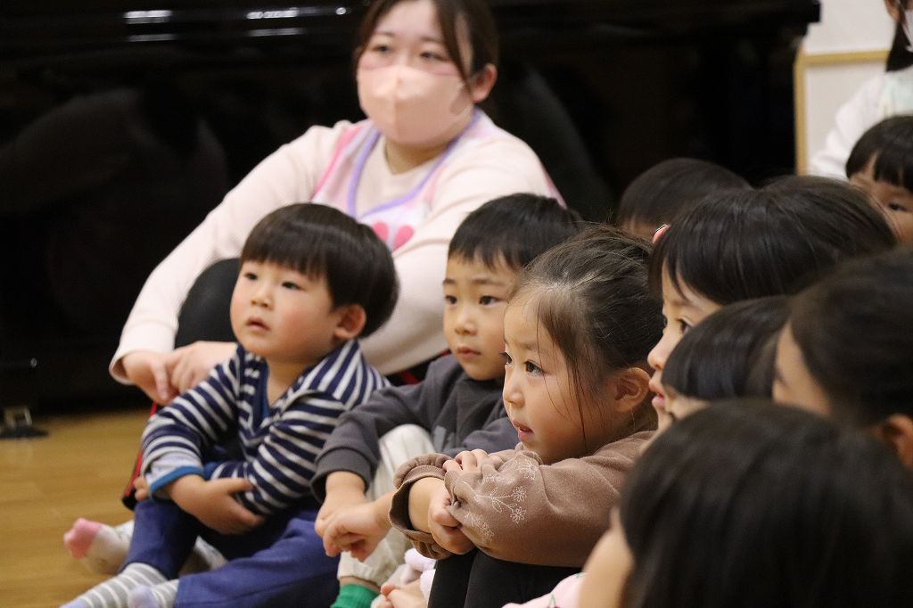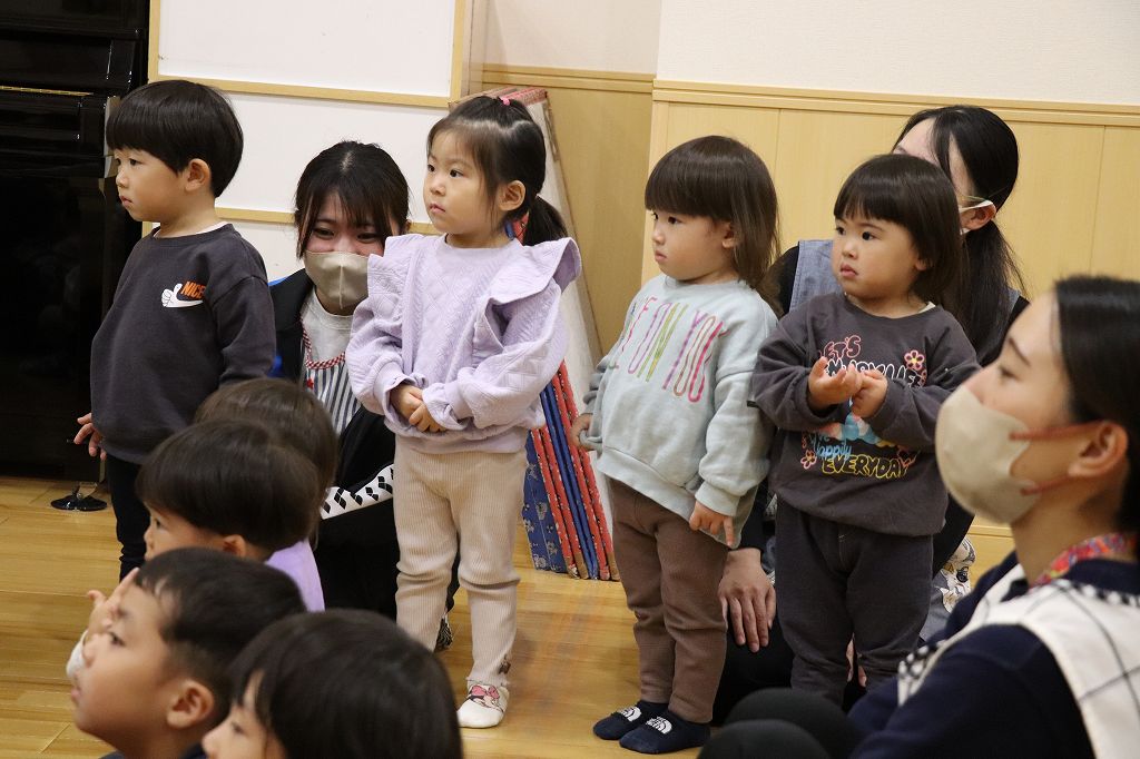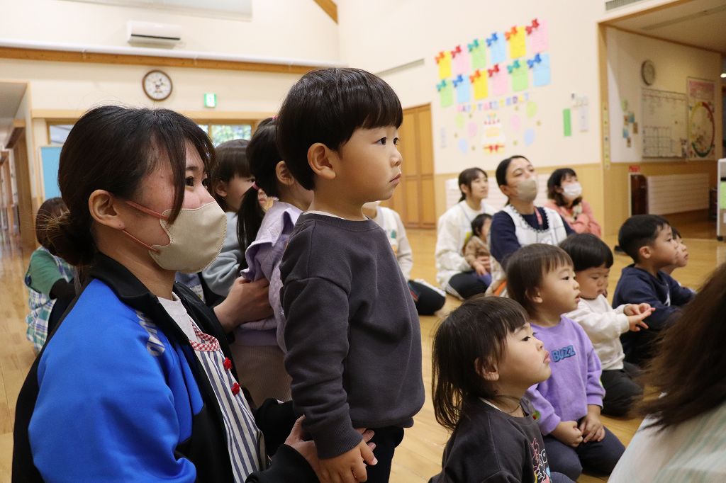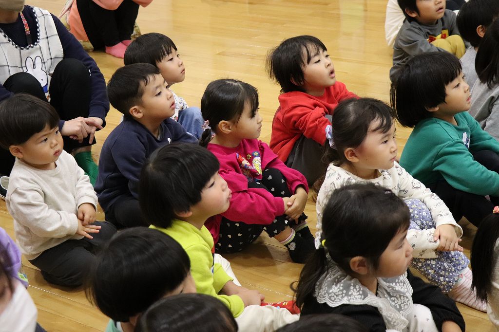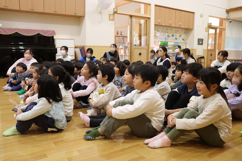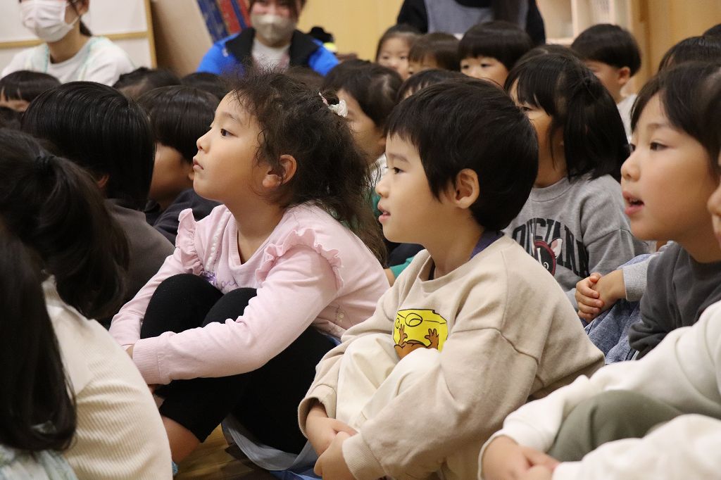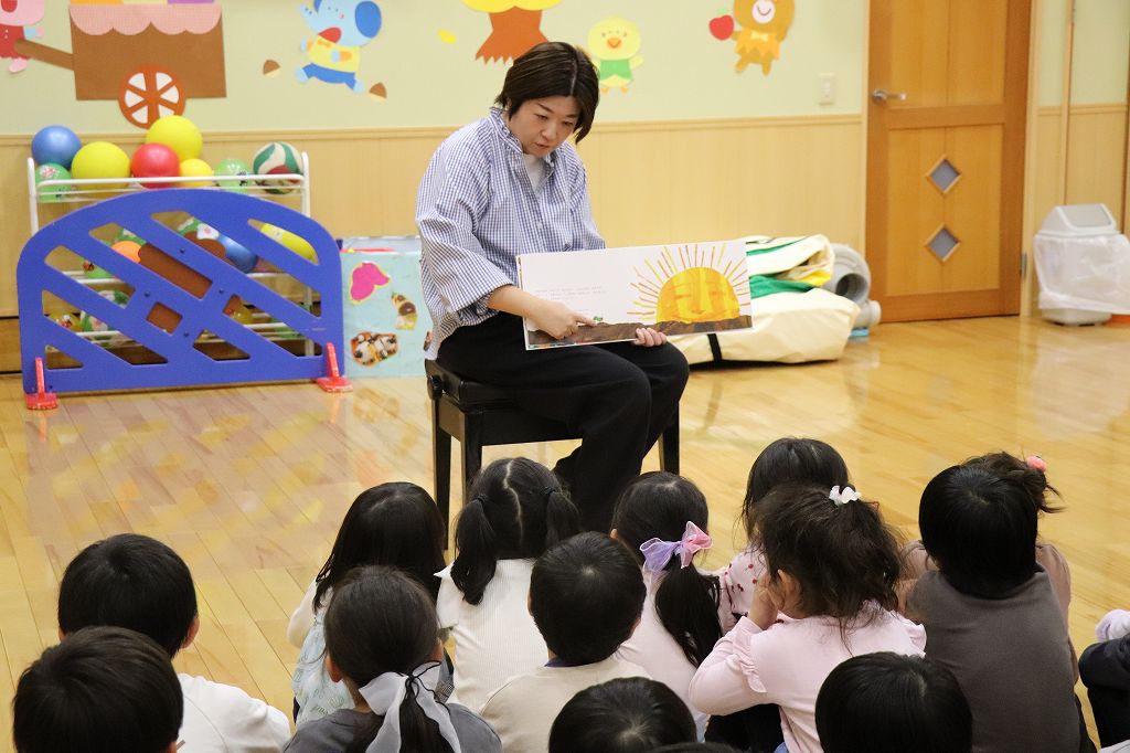 園長からお話をしたあと、『はらぺこあおむし』の絵本。歌に合わせて見ました。