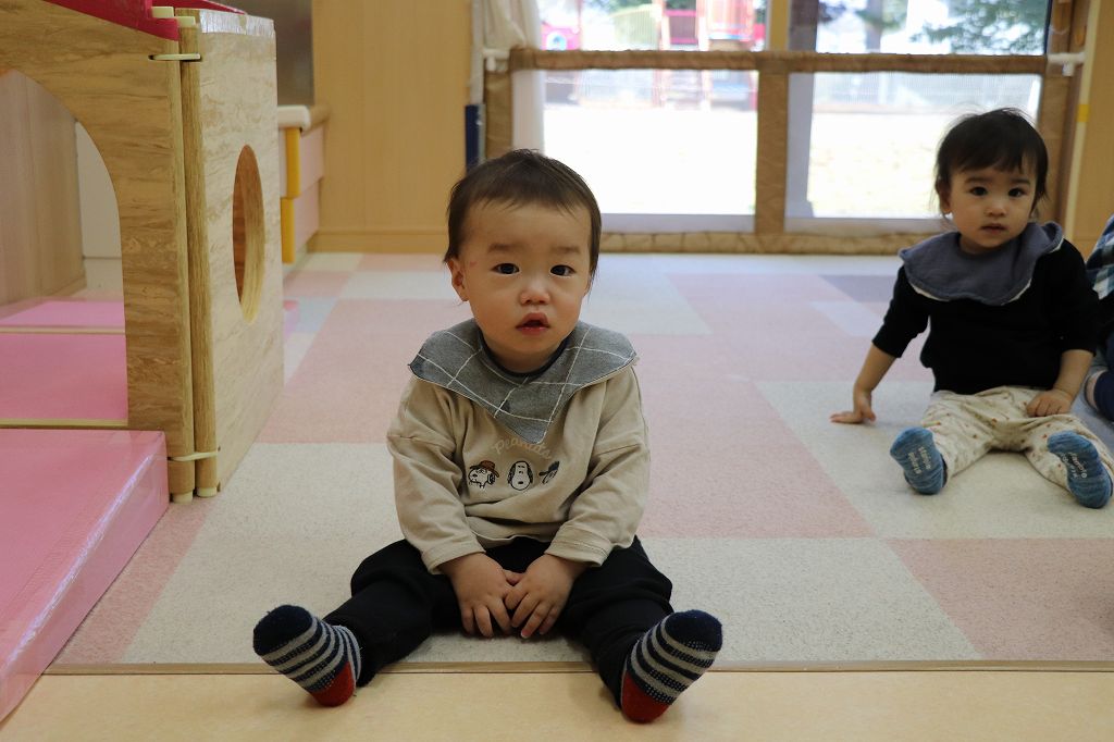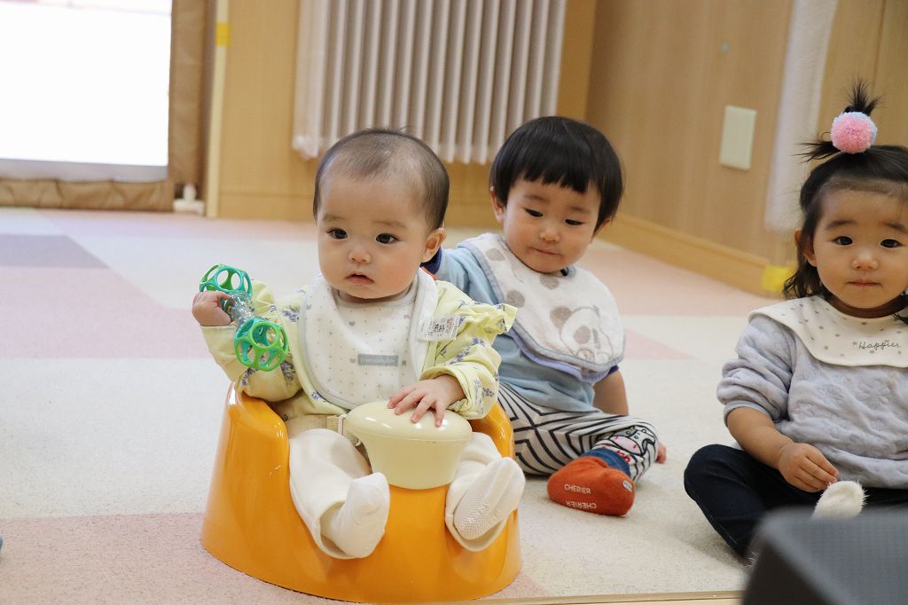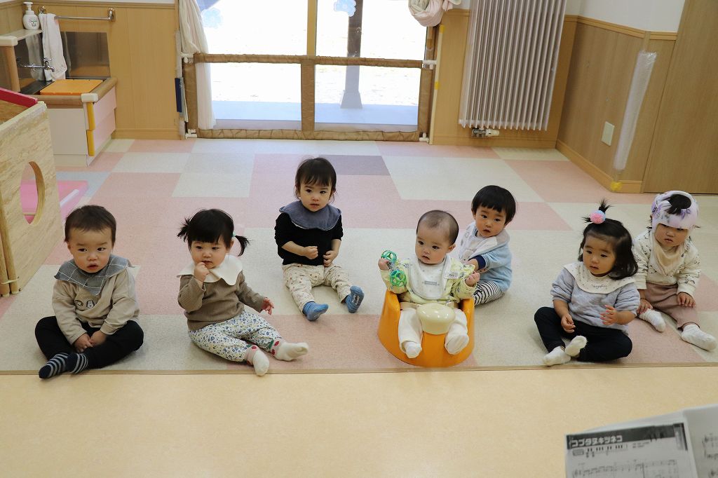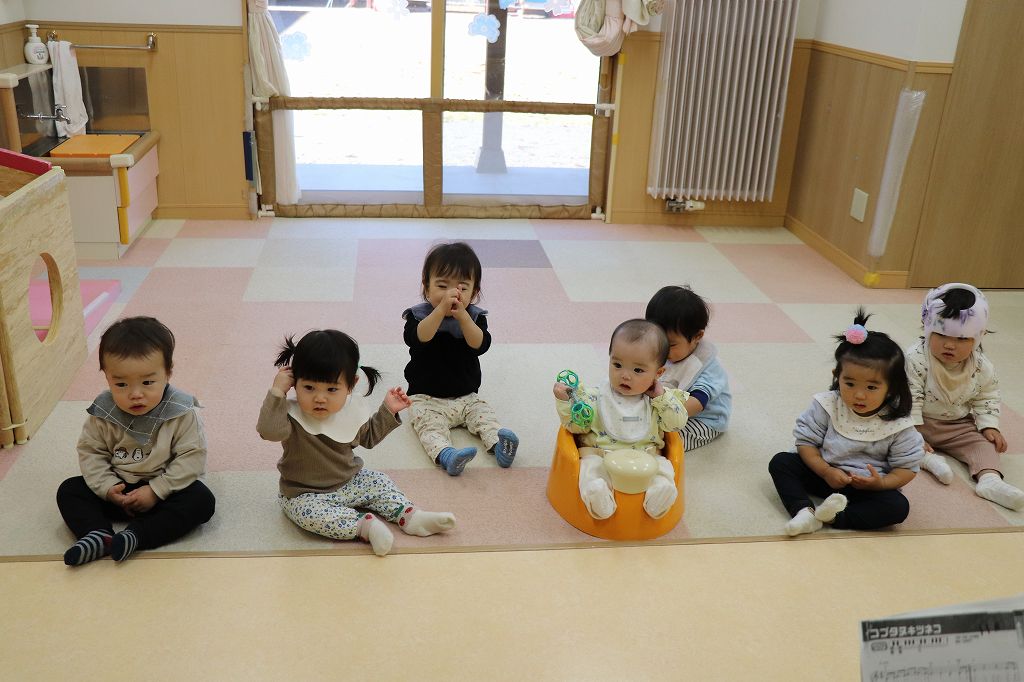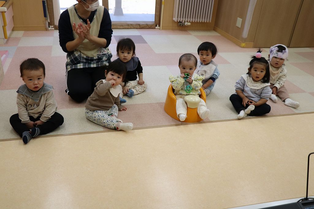 2025.11.26 とり組 朝の会 とり組朝の会。なんとみんな座ってる・・・、なんということでしょう✨0歳児でそんなことある!?すごい!先生が歌うと体を揺らしたり、拍子をとったりそれぞれ音楽を楽しんでいます。