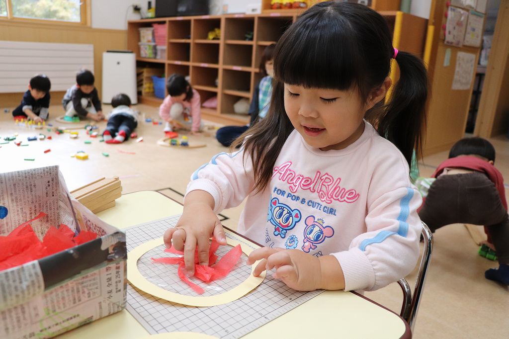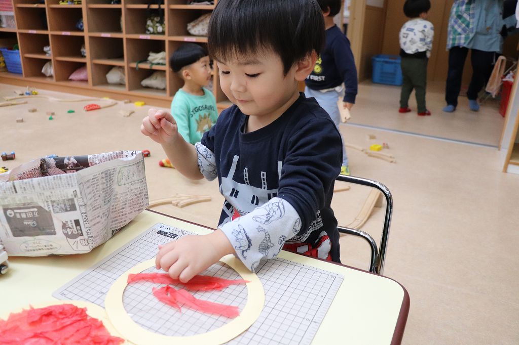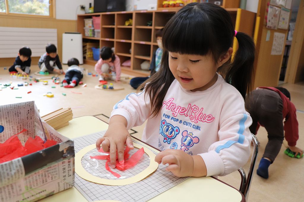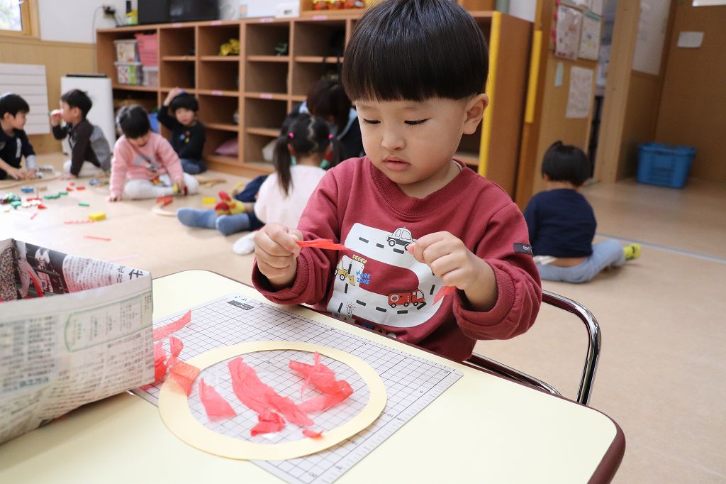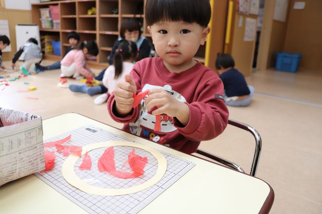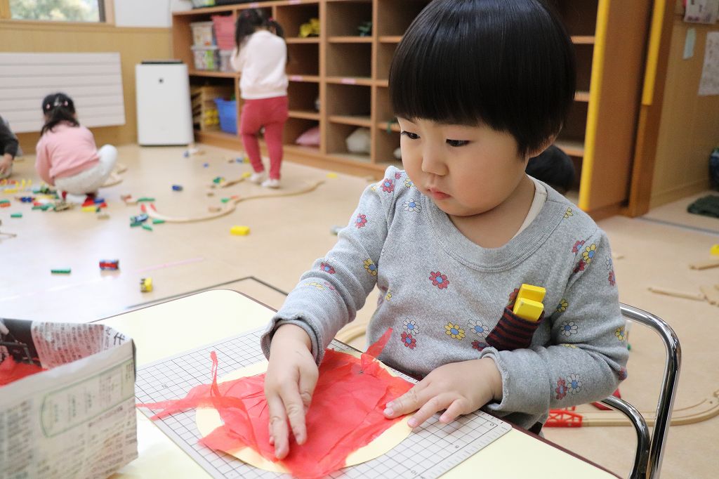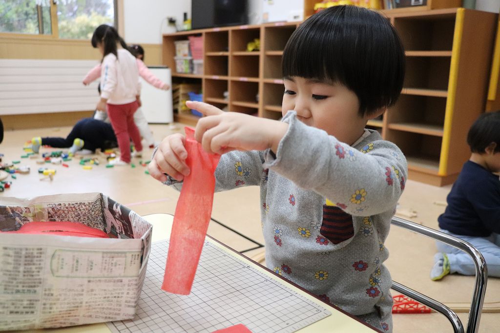 雪組はなにやら製作中。赤いおはながみ(通称:花ちり)を使って何ができるかな。