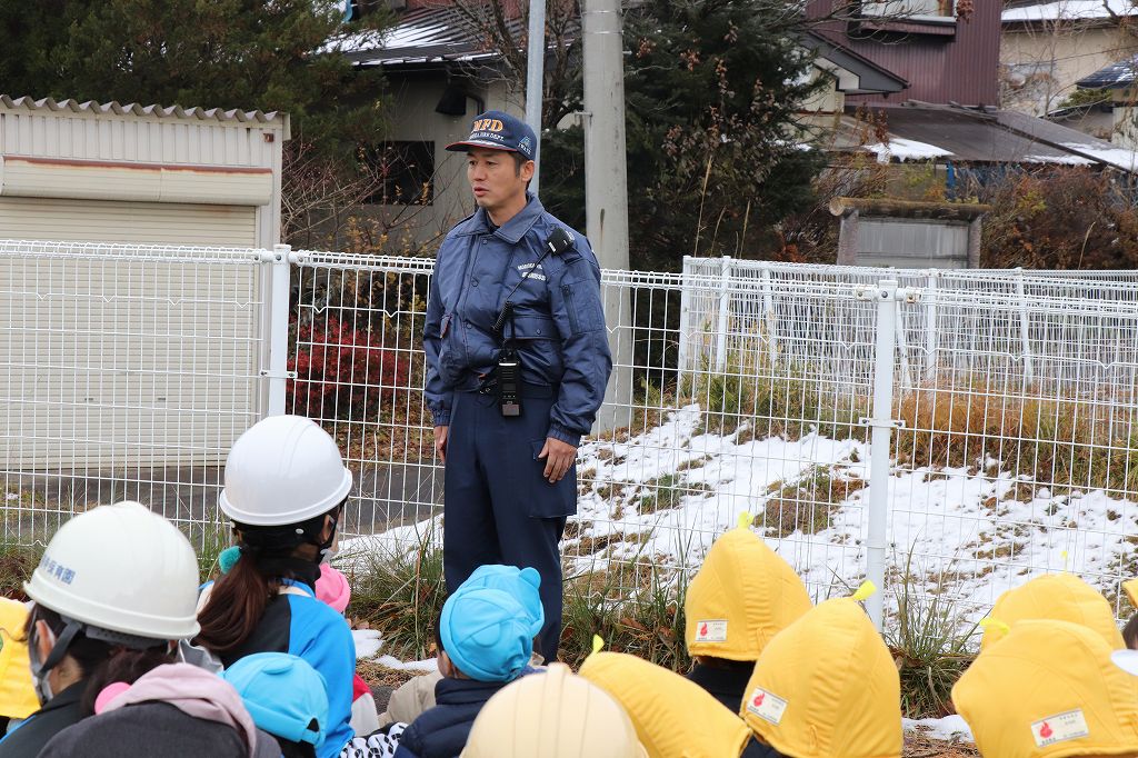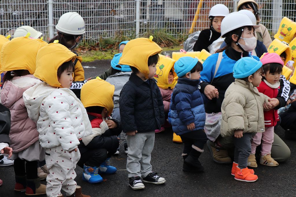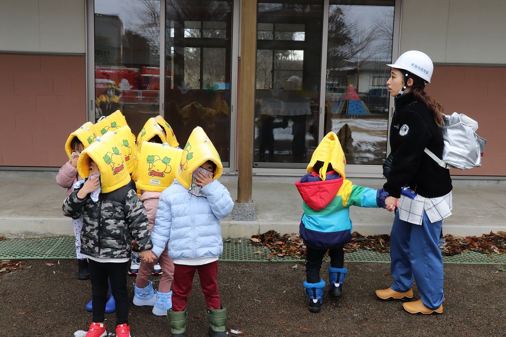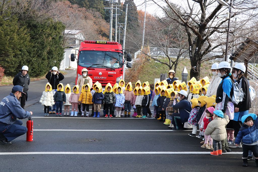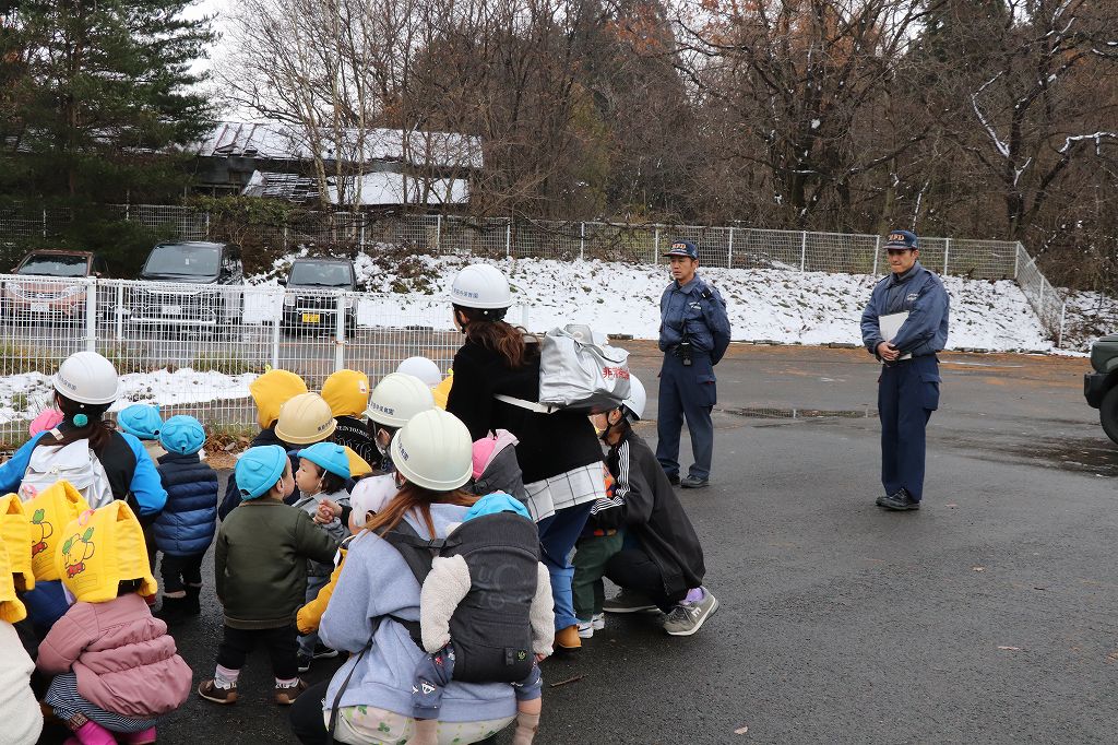 この日は消防隊員さんが2名来てくださり、保育園の避難訓練のやり方を見てアドバイスなどをしてくださいます。避難訓練を見た感想は「素晴らしい!」とのことでお褒めの言葉をいただきました。