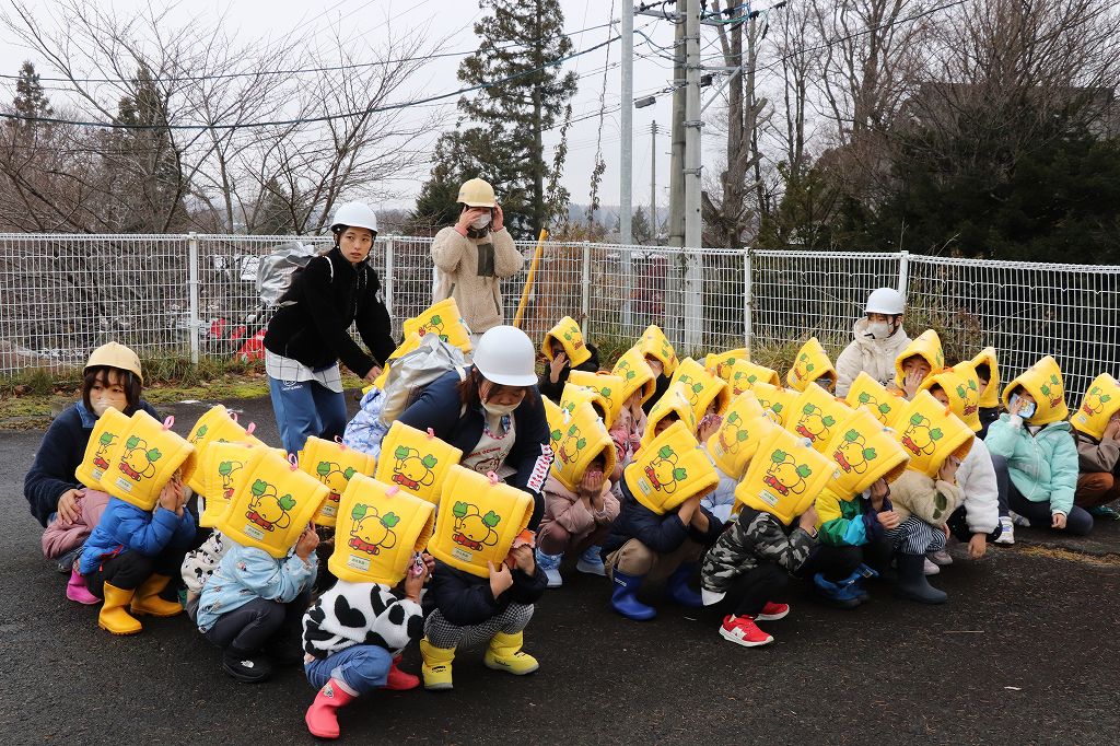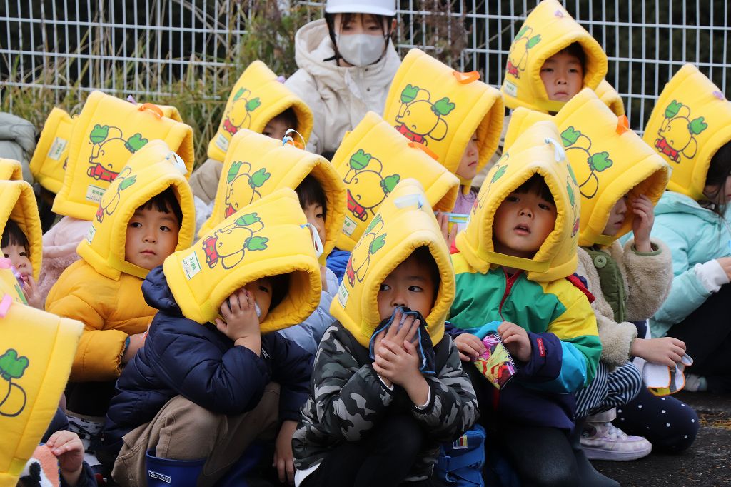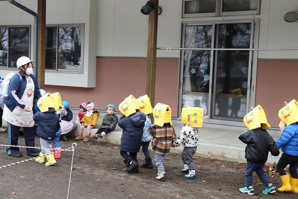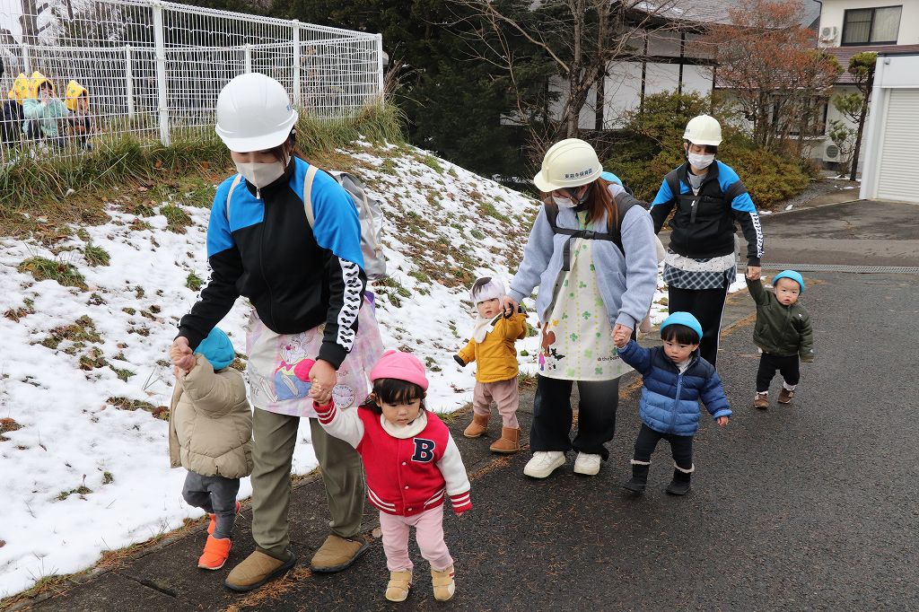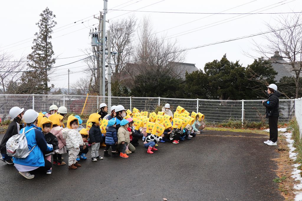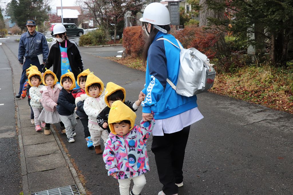 この日は消防隊員さんが2名来てくださり、保育園の避難訓練のやり方を見てアドバイスなどをしてくださいます。避難訓練を見た感想は「素晴らしい!」とのことでお褒めの言葉をいただきました。