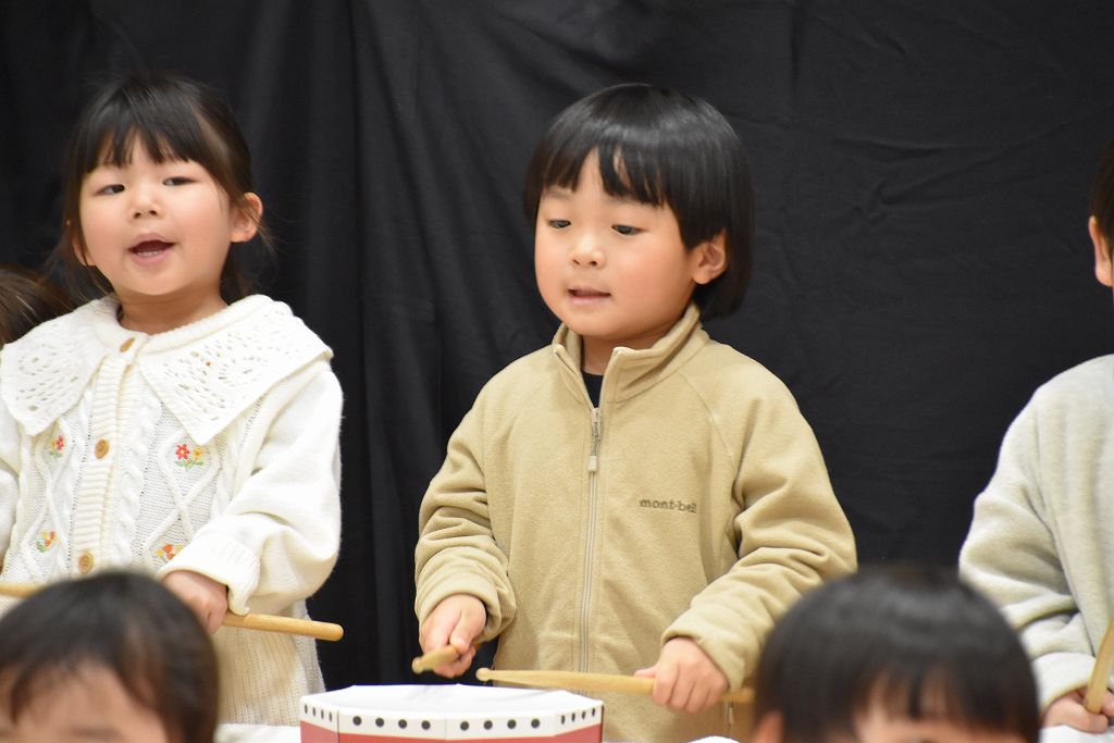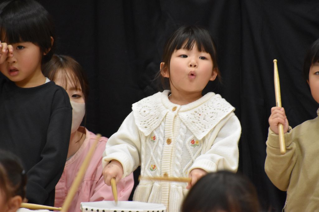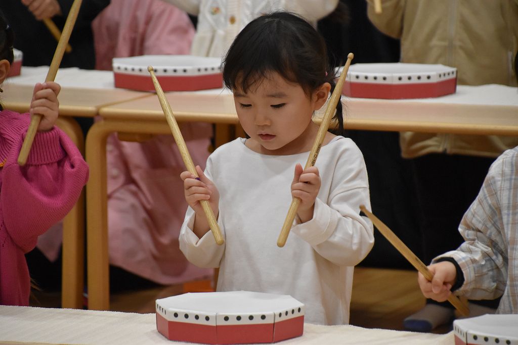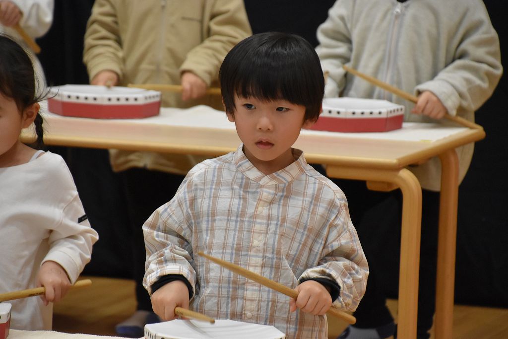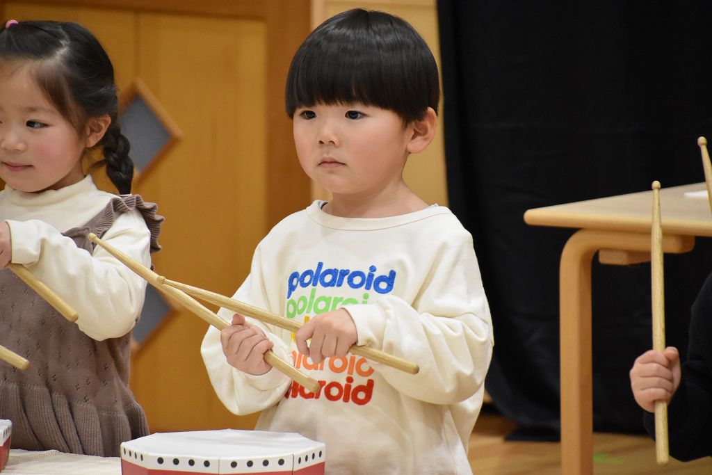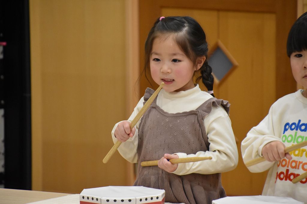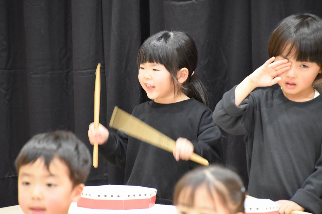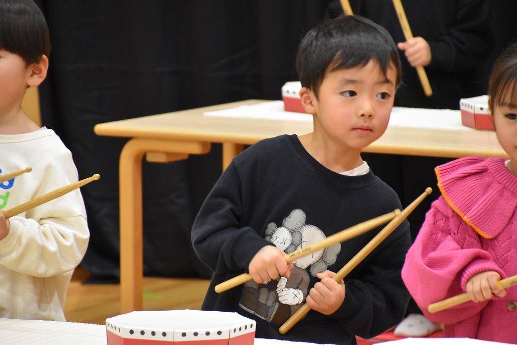 バチ打ちに挑戦。いちごとばななのリズムとわんわんこいぬのリズムをバチで演奏しました。練習では音に合わせる難しさ、音をきちんと聞く、みんなで合わせるなどなど、本当に難しかったよね。ゆずき先生が選んだ曲がとても良くて、みんなで頑張りました。さぁ、来年度は鼓隊が待ってるぞーー🥁
