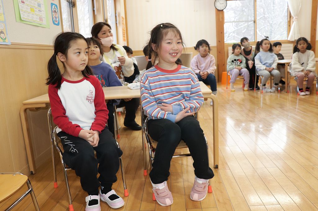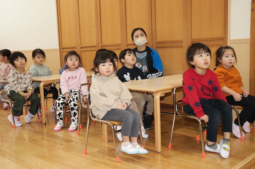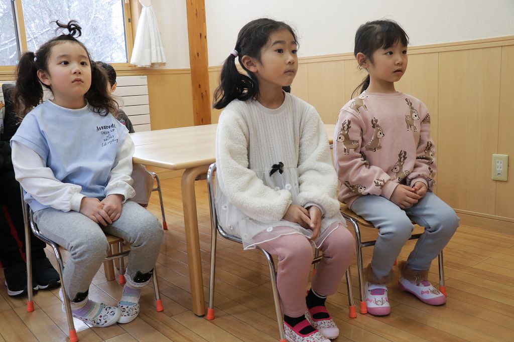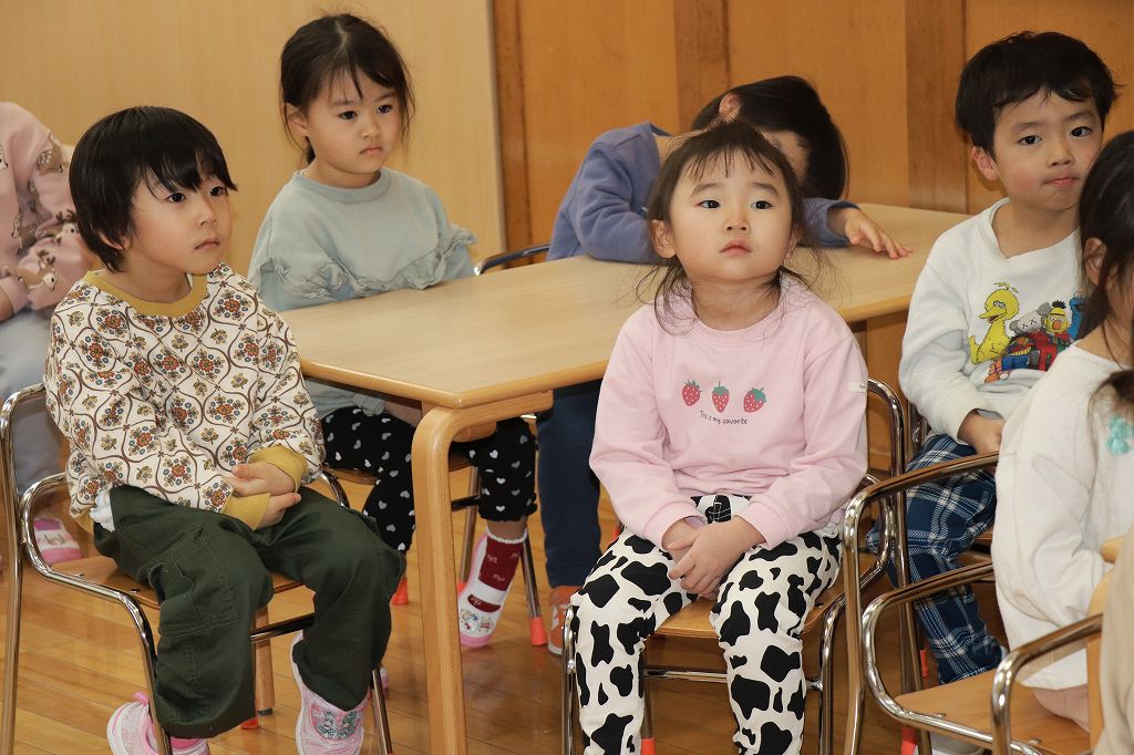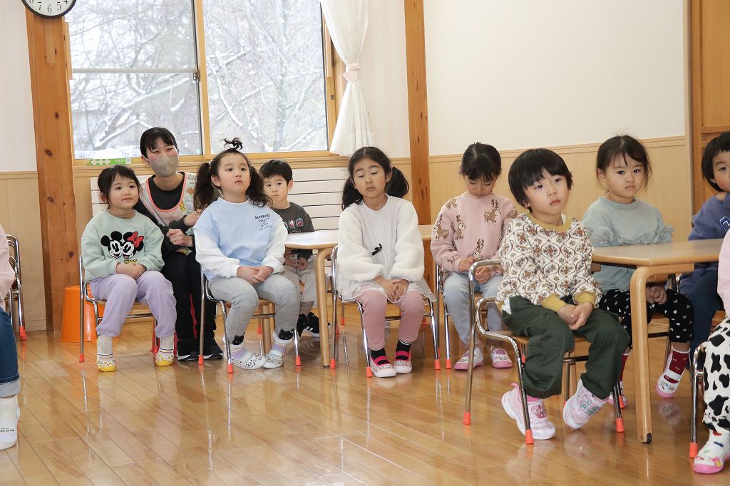 おやつのまえに集まって、栄養士のみこ先生のお話を聞きました。