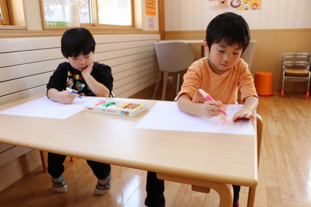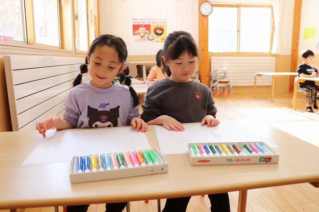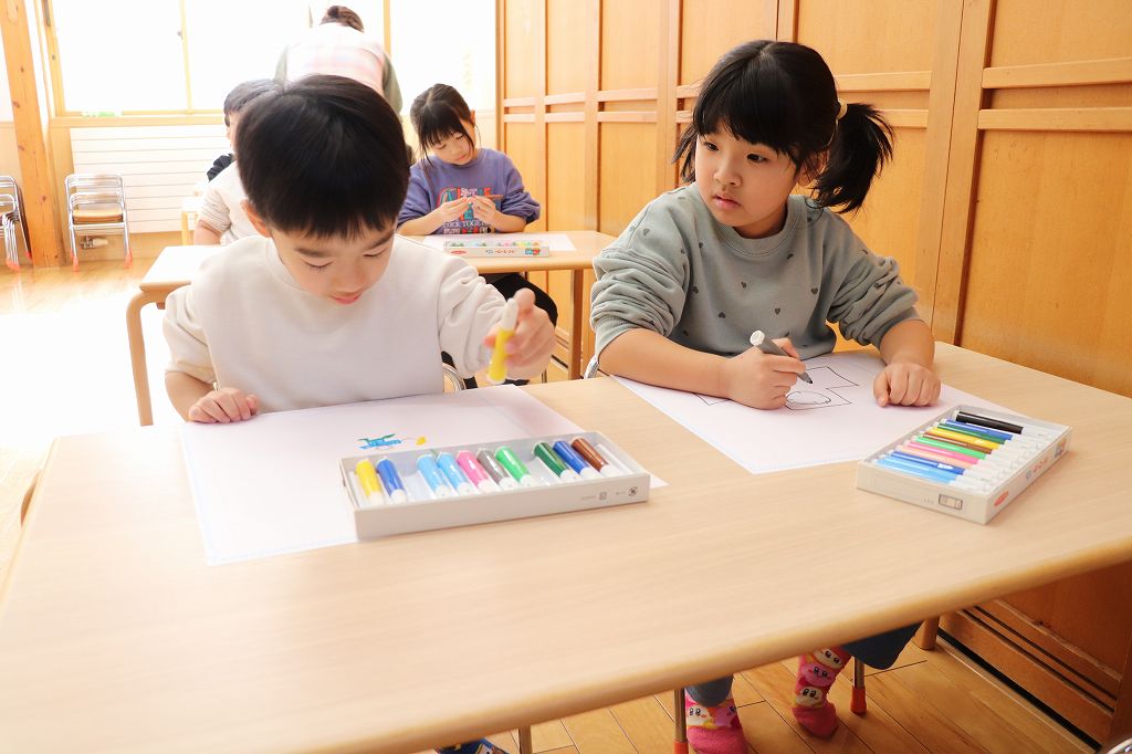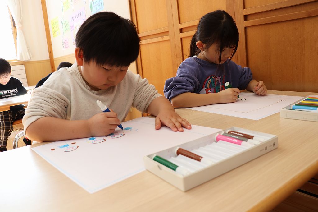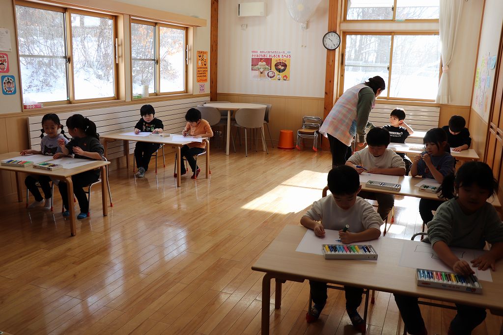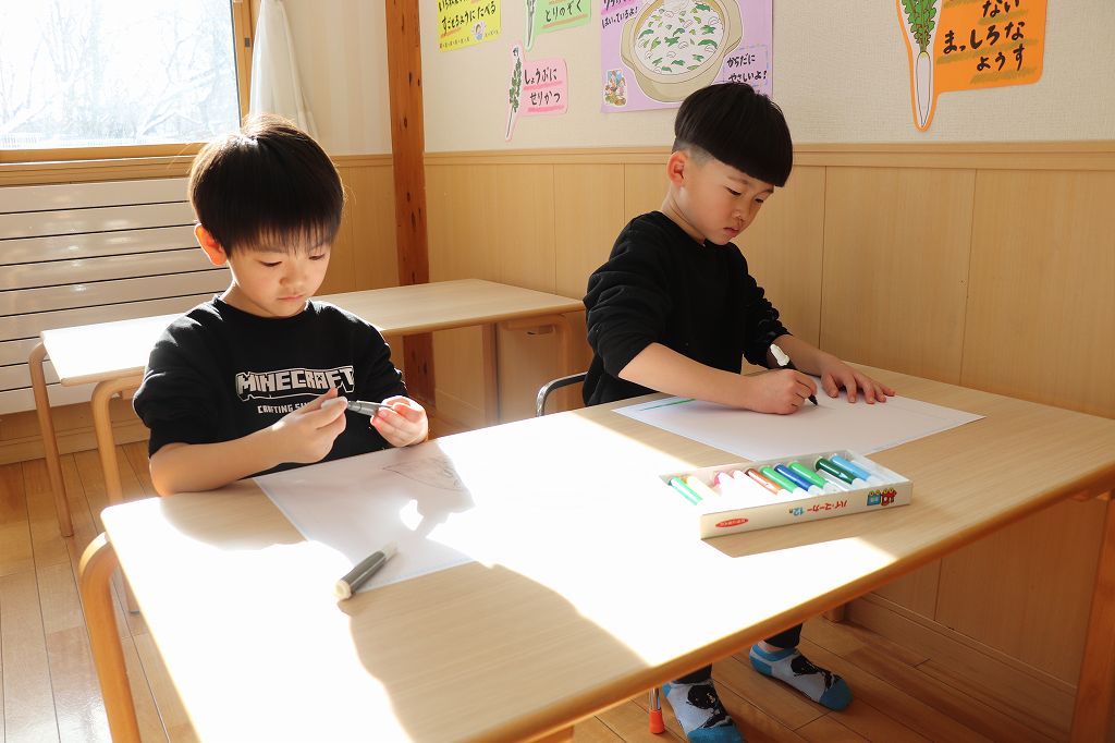 2026.01.23 日記 練習、準備、 花組、小学校に向けていろいろ準備を始めています。保育園は向かい合って座るけど、小学校って先生に向かって座るよね。というわけでその練習をしました。おぉぉー授業っぽい!!かっこいい!