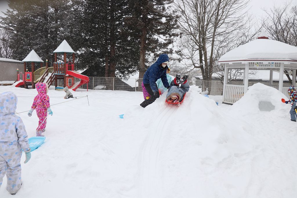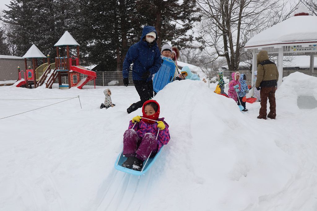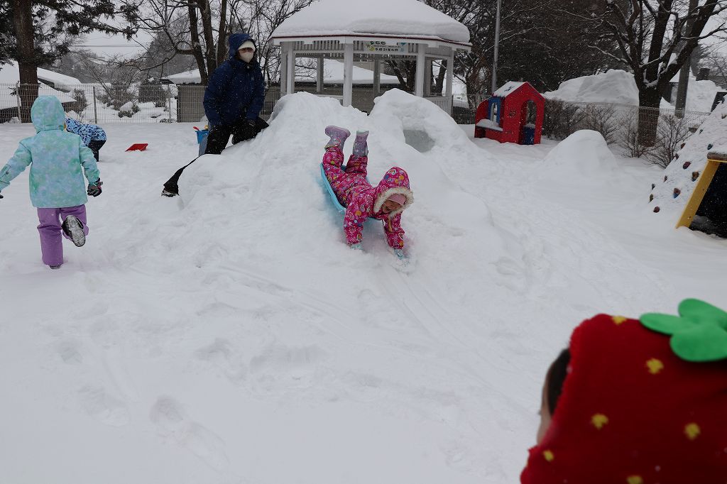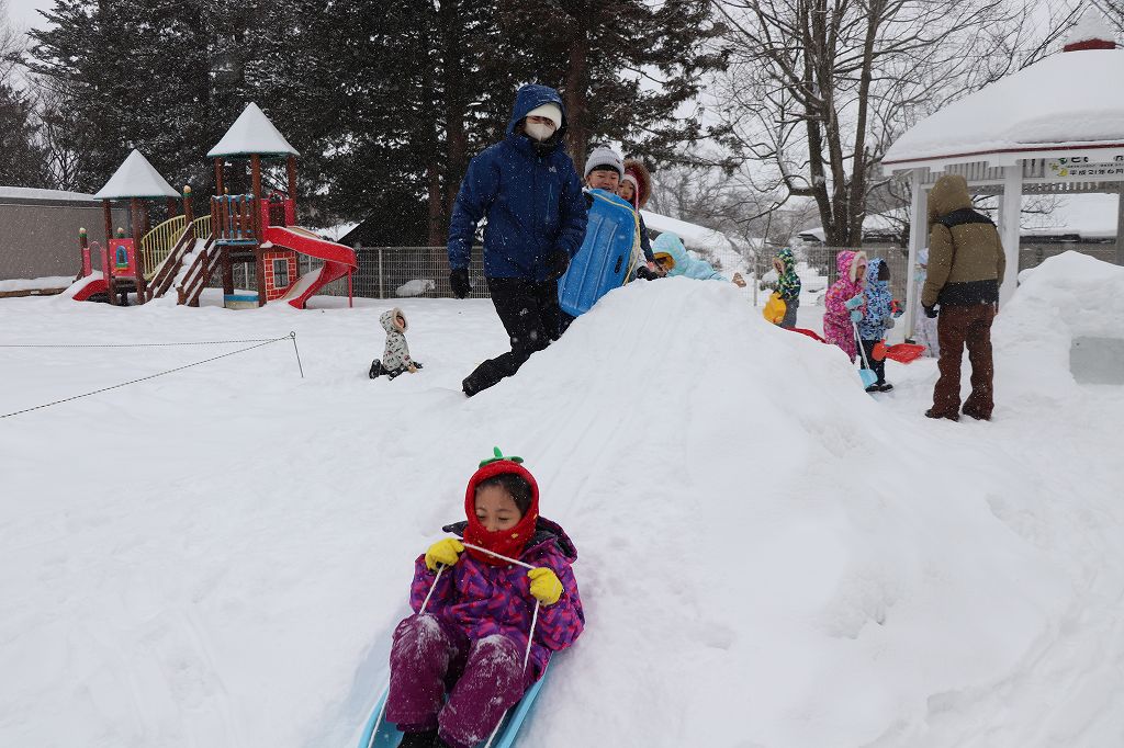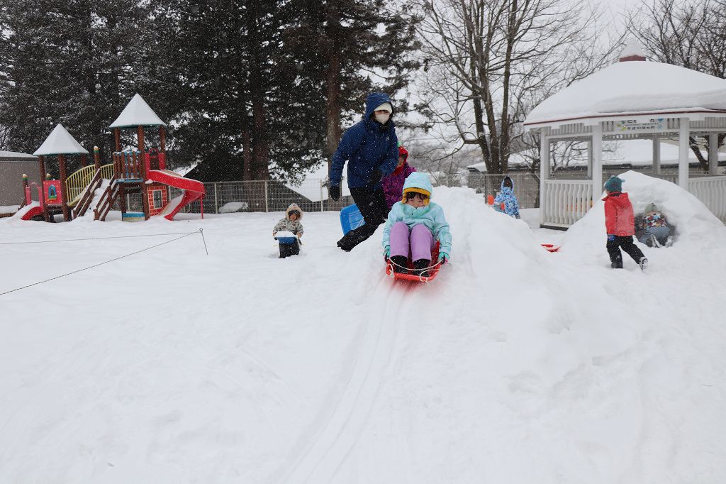 2026.01.29 日記 ソリだいすき! 小瀬さんが園庭にローダーで作ってくれた雪山!これはもう、ソリ山だーー⛄それなりの傾斜があってとってもたのしい!雪国の田頭は寒くて雪解けは先。まだまだ遊べるね!