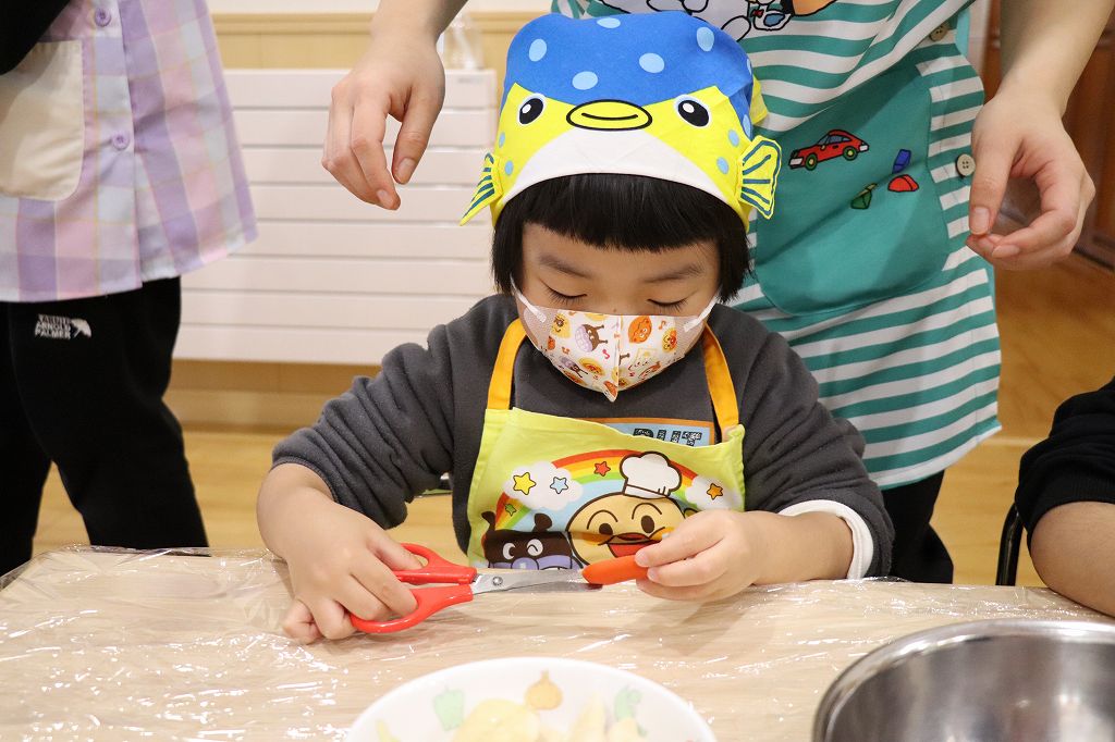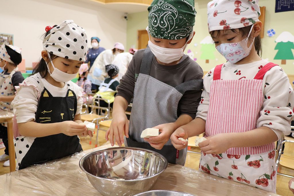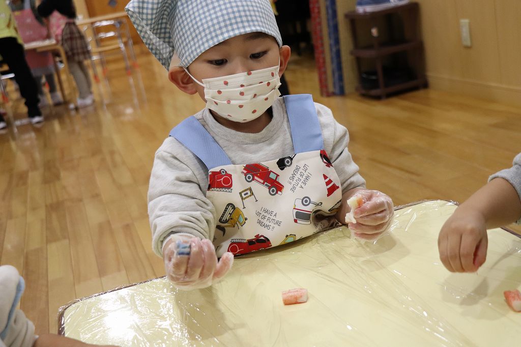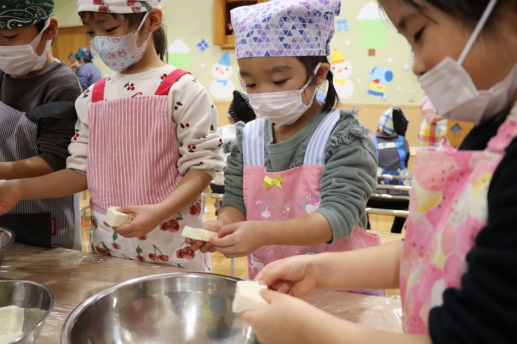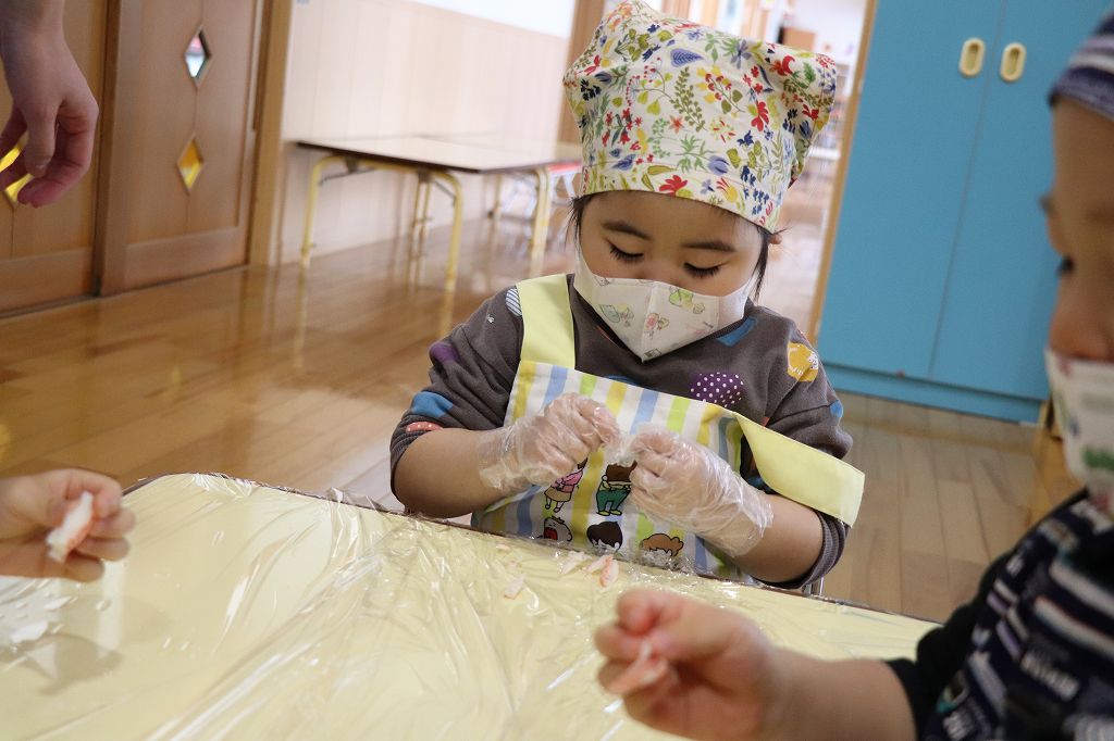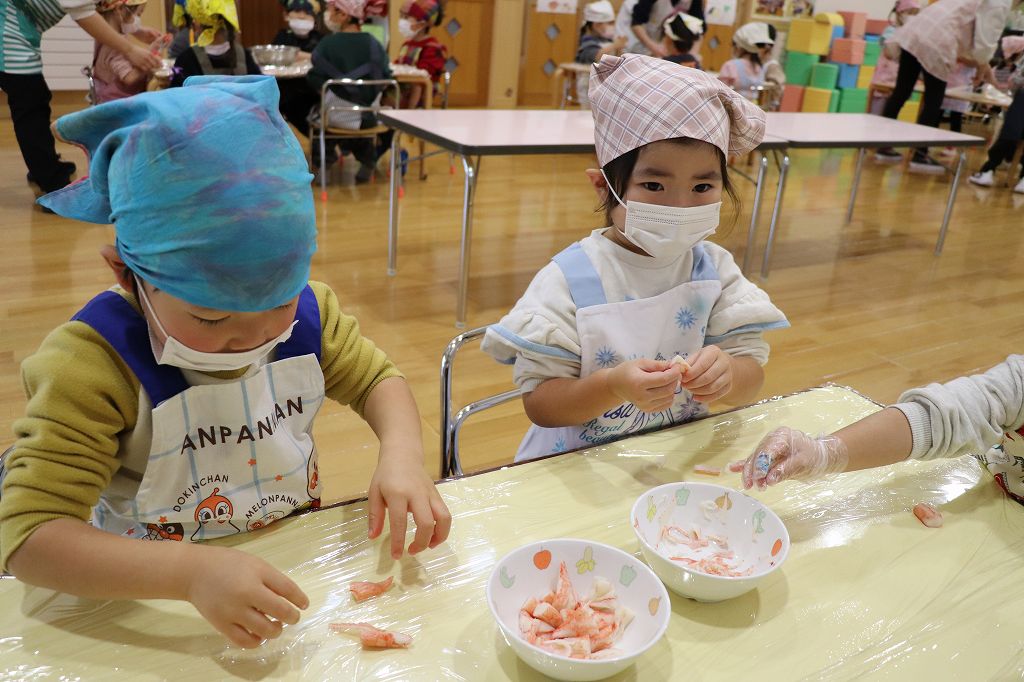 2026.02.25 行事 クッキングパーティー② 雪組・カニカマさき、月組・カニさんウィンナーづくり、星組・豆腐ちぎり、花組・包丁生卵が偶然顔になって大喜び花組食育は匂いをかぐのも大事。ただ作業するのではなく、しっかり活動するんです!