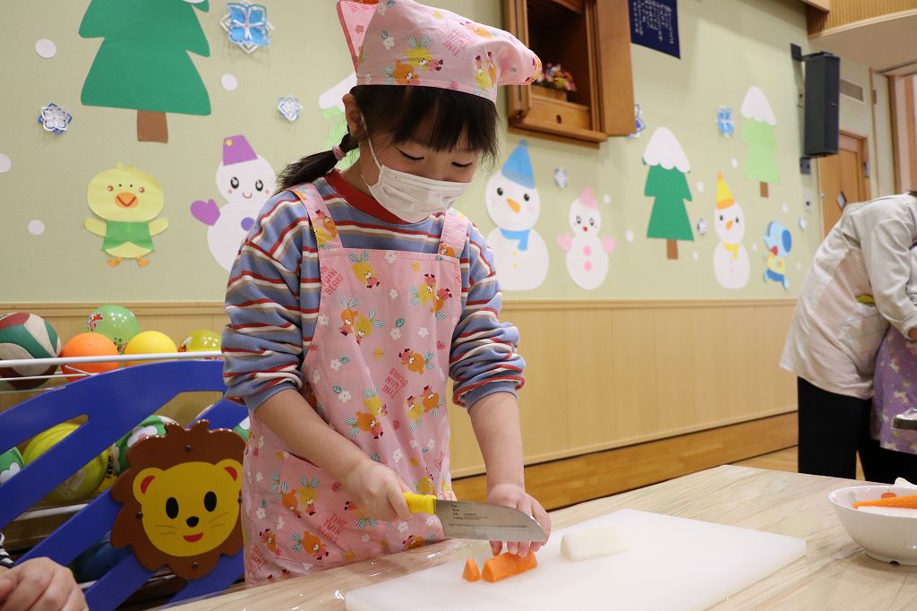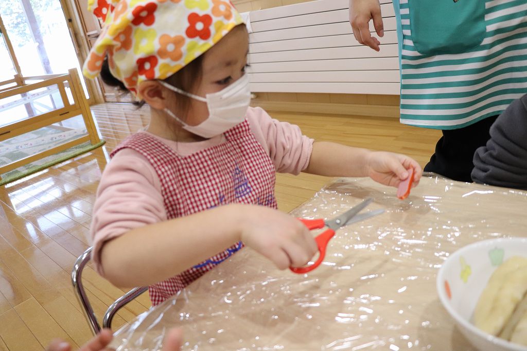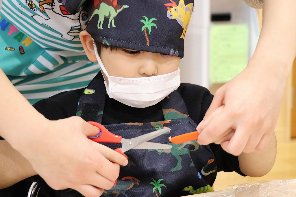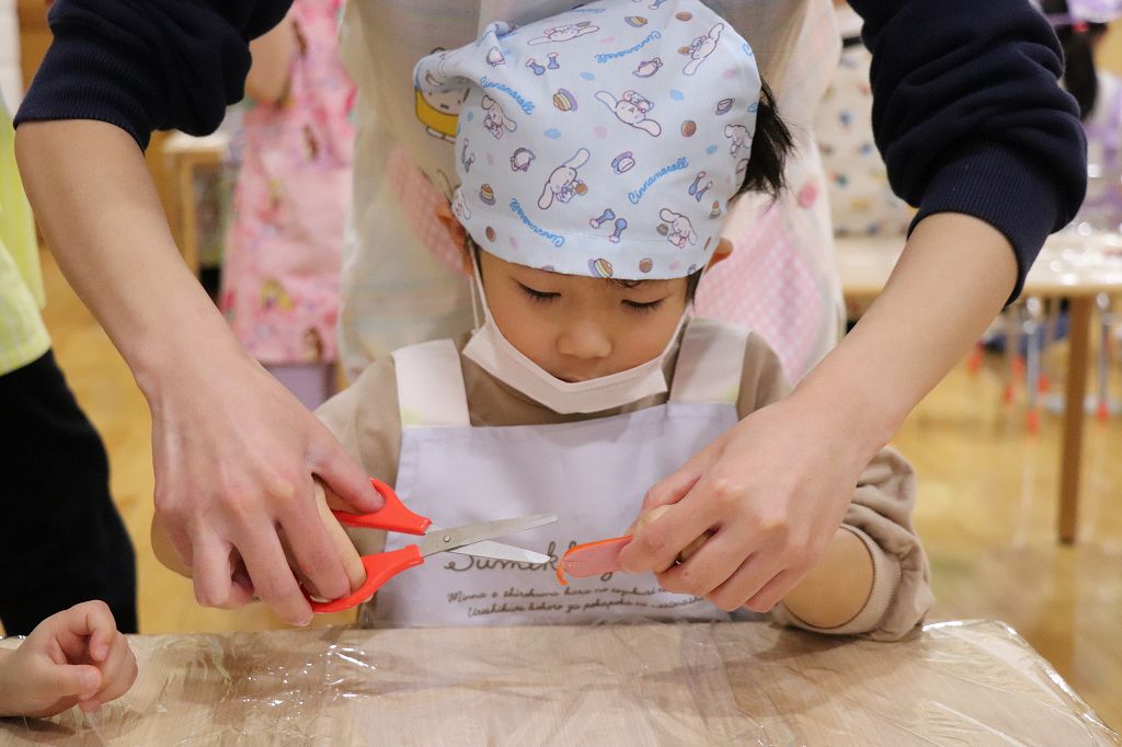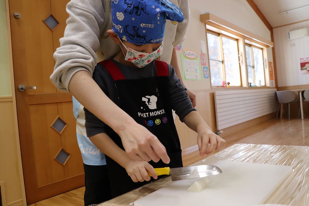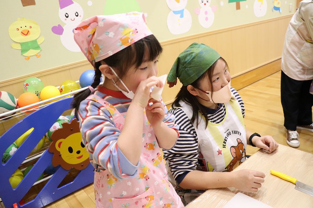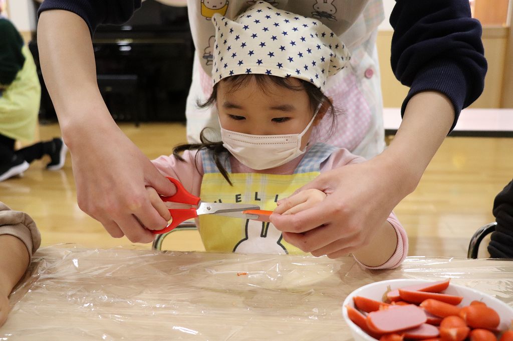 2026.02.25 行事 クッキングパーティー② 雪組・カニカマさき、月組・カニさんウィンナーづくり、星組・豆腐ちぎり、花組・包丁生卵が偶然顔になって大喜び花組食育は匂いをかぐのも大事。ただ作業するのではなく、しっかり活動するんです!