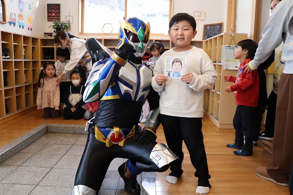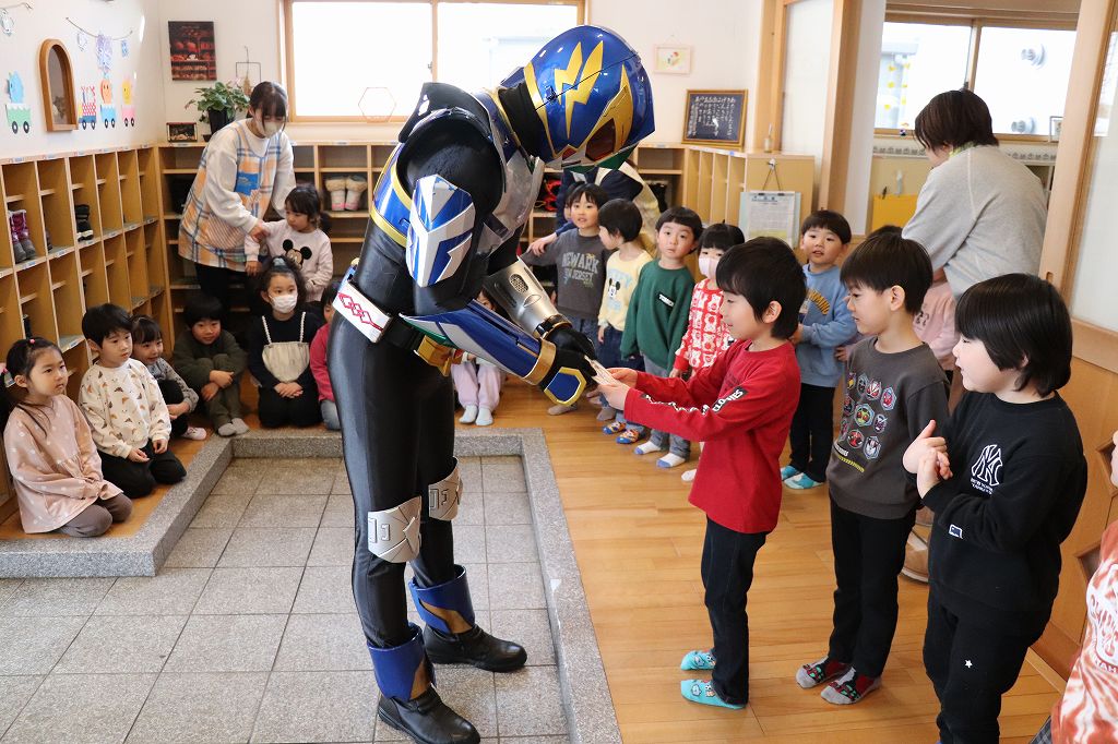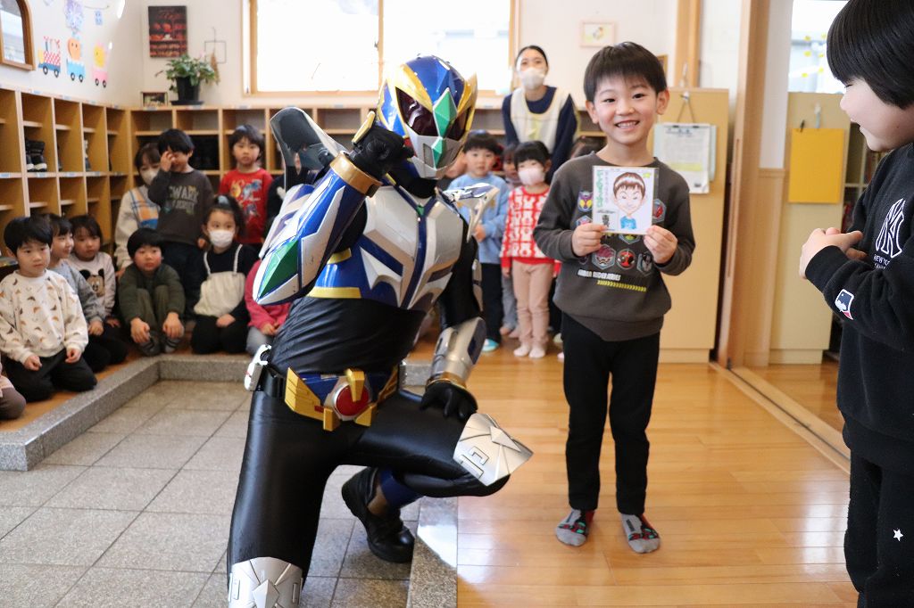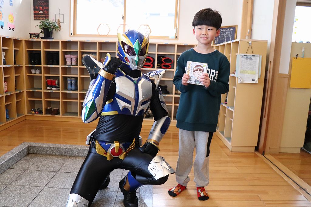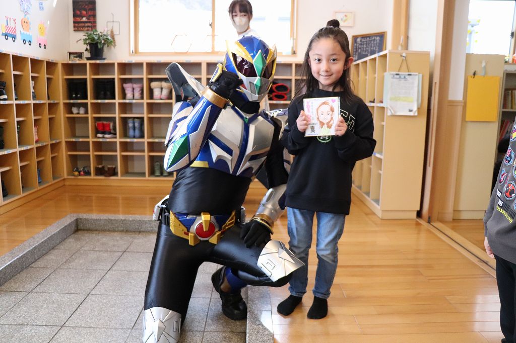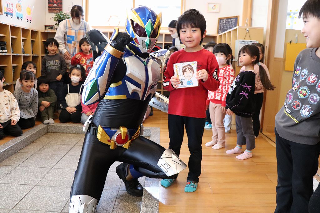 2026.03.19 花組 似顔絵事業① ハチマンタイラーがやってきた!八幡平市商工会の事業で、タグさんが卒園祝いとして市内年長児の似顔絵を描いてくださっています。これが絶妙に似てる!受け取り式を行いました。