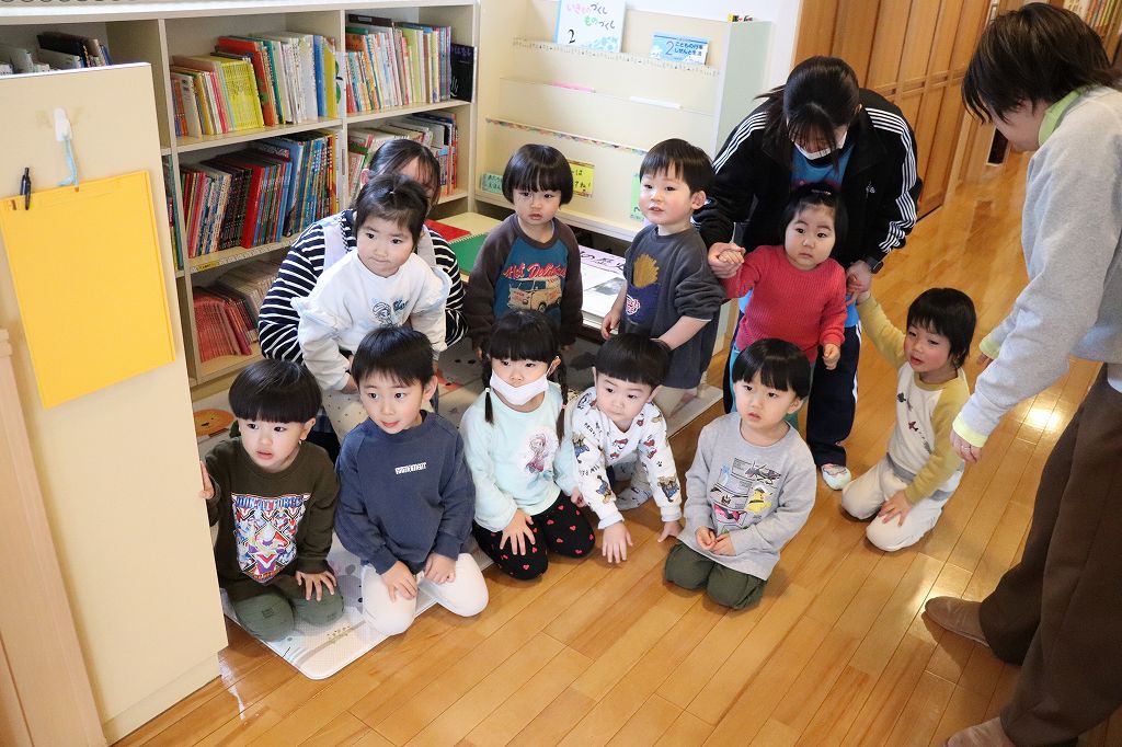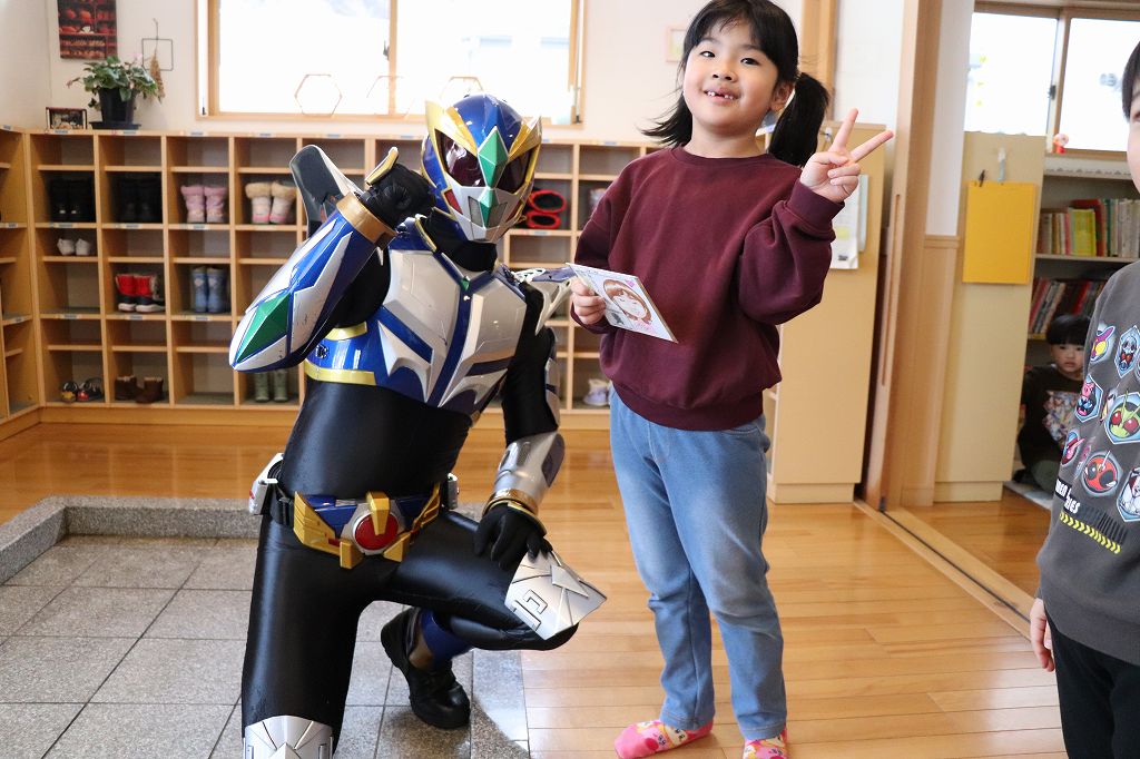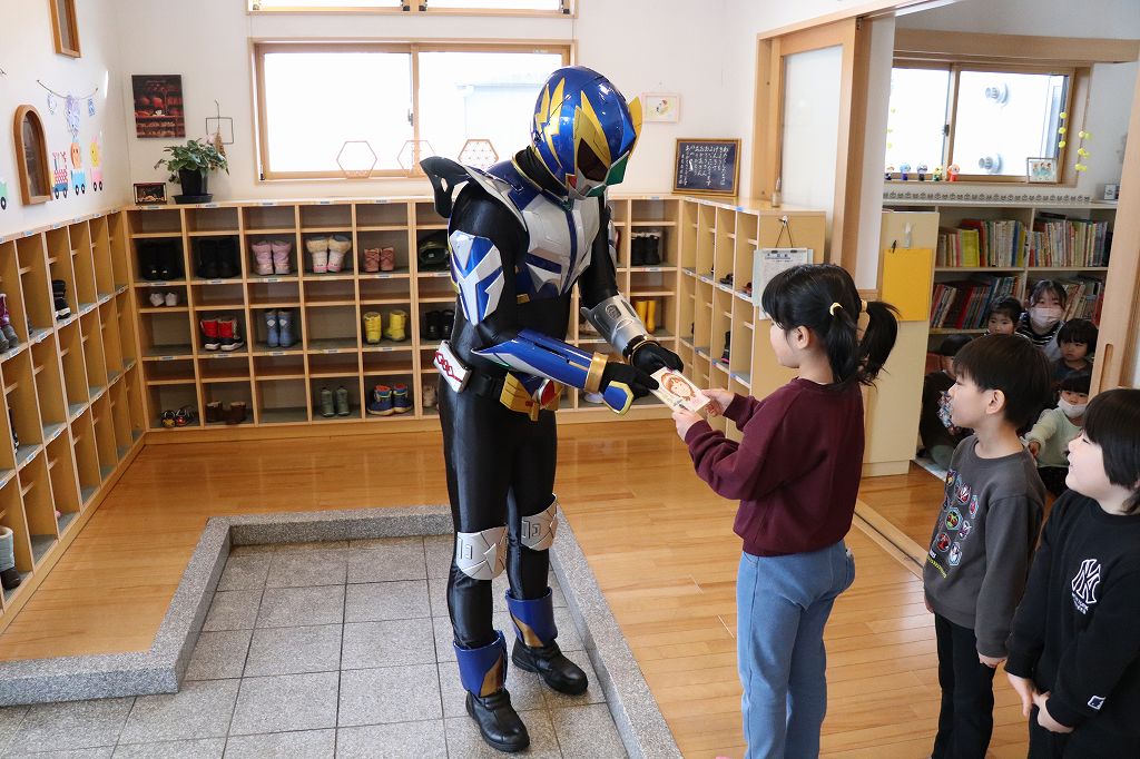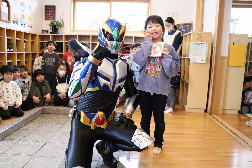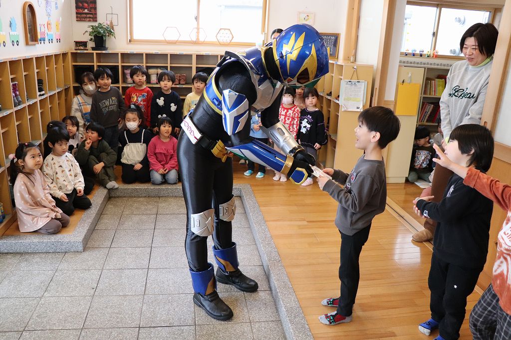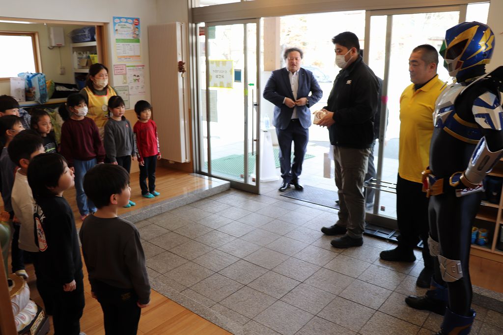 2026.03.19 花組 似顔絵事業① ハチマンタイラーがやってきた!八幡平市商工会の事業で、タグさんが卒園祝いとして市内年長児の似顔絵を描いてくださっています。これが絶妙に似てる!受け取り式を行いました。