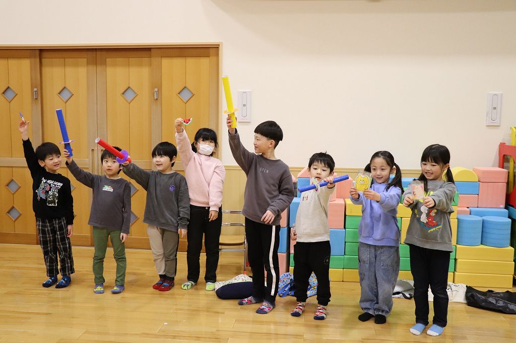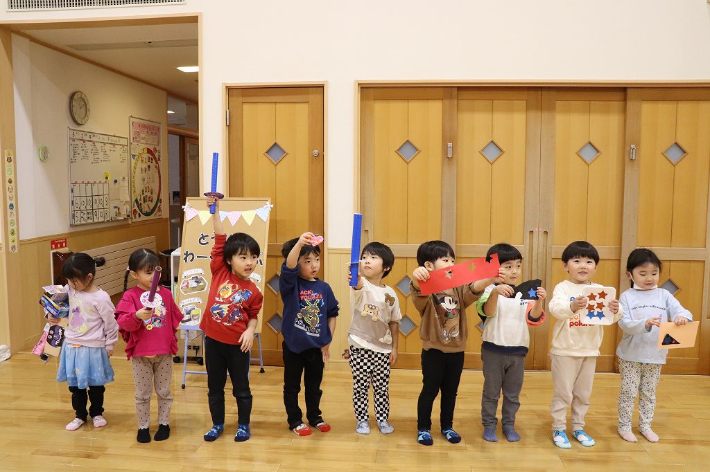 集まって~と言ったら、なぜかクラスが一列に。たこやきとフライドポテトを食べました。